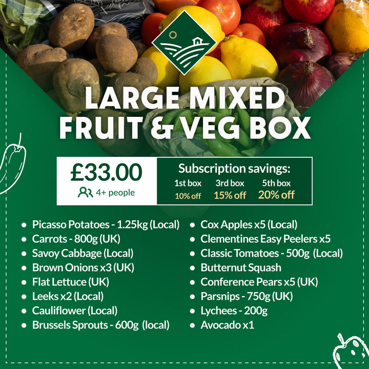 Our Large Mixed Box will contain approximately; 1.25kg of potatoes, 900g of carrots, at least one type of brassica (cabbage/cauliflower/kale etc), 4 onions or 500g of shallots, at least two salad options, four varieties of fruit (x5 or a larger, premium option like strawberries/blueberries/pineapples etc) plus six or seven different premium, seasonal items selected from the best, locally sourced options available to us each week.