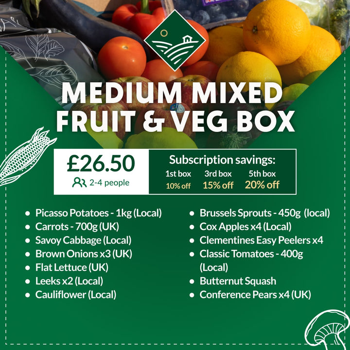 Our Medium Mixed Box will contain approximately; 1kg of potatoes, 750g of carrots, at least one type of brassica (cabbage/cauliflower/kale etc), 3 onions or 400g of shallots, at least two salad options, three varieties of fruit (x4 or a larger, premium option like a mango/cherries/melon etc) plus four different seasonal items selected from the best, locally sourced options available to us each week.