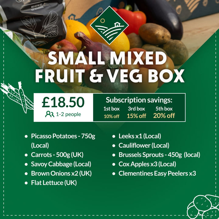 Our Small Mixed Box will contain approximately; 750g of potatoes, 500g of carrots, at least one type of brassica (cabbage/cauliflower/kale etc), 2 onions or 300g of shallots, at least one salad option, two varieties of fruit (x3 apples/pears/plums/oranges etc) plus three different seasonal items selected from the best, locally sourced options available to us each week.