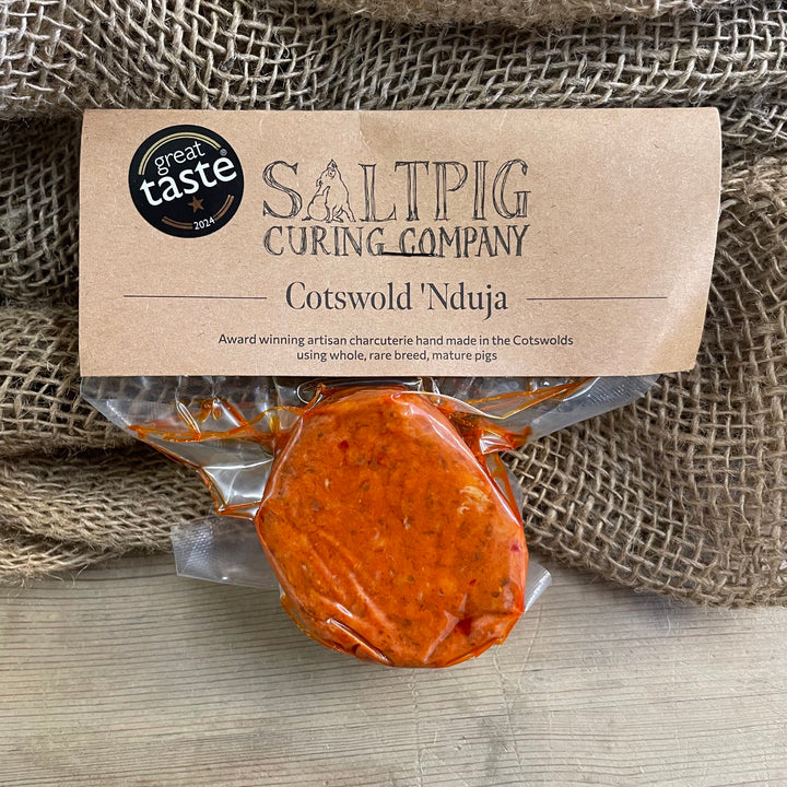 Inspired by a classic Calabrian staple, this fiery, soft, spreadable salami is made using chillies grown in the Cotswolds. It’s a versatile ingredient that adds heat and depth to a wide range of dishes, or can simply be spread on good bread for those who like a bit of a kick. A favourite pizza topping, it also works beautifully with eggs, pasta, and seafood.