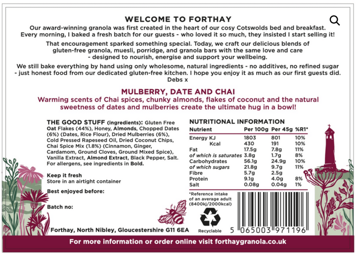 Gluten Free Oat Flakes (44%), Honey, Almonds, Chopped Dates (6%) (Dates, Rice Flour), Dried White Mulberries (6%), Cold Pressed Rapeseed Oil, Dried Coconut Chips, Chai Spices (1.8%) (Ground Cinnamon, Ground Ginger, Ground Cardamom, Ground Cloves, Ground Allspice), Almond Extract, Vanilla Extract Black Pepper, Salt